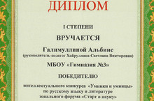 В Чистопольском педагогическом колледже прошел интеллектуальный конкурс «Умники и умницы», проводимый в рамках зонального форума «Старт в науку». Галимуллина Альбина, ученица 10 А класса (учитель Хайруллина С.В.) стала победителем данного конкурса. Поздравляем!
