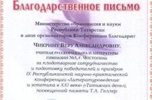 Министерство образования и науки Республики Татарстан благодарит Чикрину Веру Александровну, учителя русского языка и литературы нашей гимназии за подготовку победителя и призера IX Республиканской научно-практической конференции «Литературоведение и эстетика в XXI веке» («Татьянин день»), посвященной памяти Т.А. Геллер. Поздравляем!