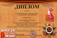 Дипломом 1 степени VI Республиканского открытого конкурса творческих работ «Мы победили!» награждена Гаязова Милана, ученица 11 класса. Поздравляем Милану и её руководителя Гатиятову В.И. Молодцы! Дальнейших творческих успехов!