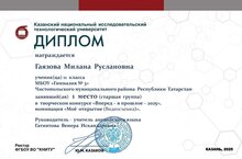 Гаязова Милана, ученица 11 класса заняла 1 место в Республиканском творческом конкурсе «Вперед – в прошлое-2025» в номинации «Моё открытие». Поздравляем Милану и её руководителя Гатиятову В.И. Молодцы! Дальнейших творческих успехов!