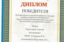 Дипломом победителя Муниципального этапа республиканского конкурса семейного творчества «Калейдоскоп» среди обучающихся общеобразовательных школ Чистопольского муниципального района награждена Нуруллина Аделина, ученица 3Б класса. Поздравляем с победой! Молодец! Дальнейших творческих успехов!