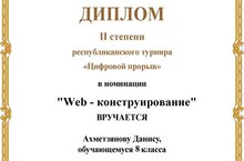 Дипломом 2 степени республиканского турнира «Цифровой прорыв» в номинации «Web-конструирование» награжден Азметзянов Данис, ученик 8 класса. Поздравляем Даниса и его учителя Шамсутдинову Э.Р. Дальнейших творческих успехов!