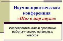 Состоялась научно-практическая конференция исследовательских и проектных работ «Шаг в мир науки» для учащихся начальных классов. Учащиеся 3-4 классов продемонстрировали навыки исследовательской деятельности в разных направлениях, творчески подошли к защите своих работ и проектов. Всего на рассмотрение было представлено 16 работ. Победители и призеры получили право участвовать 23.04.2011года на муниципальной научно-практической конференции.