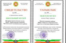 За большую поисково-исследовательскую общественно-полезную работу, создание интересной экспозиции и успехи в воспитании учащихся нашему музею присвоено звание "Школьный музей" (свидетельство МО и Н РТ №666 от 18.01.2013г.)