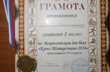 Хайруллина М., ученика 11 класса, занявшего I место во Всероссийском дне бега "Кросс Татарстана - 2016" среди учащихся 10-11 классов. Молодец!