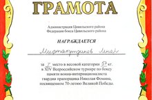 Поздравляем Мифтахутдинова Л.А., занявшего I место в XIV Всероссийском турнире по боксу памяти воина-интернационалиста гвардии прапорщика Николая Фомина, посвященном 70-летию Великой Победы, в весовой категории 57 кг. Молодец!