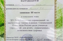 Команда школы приняла участие в Зональном этапе XV Республиканских соревнований по настольному теннису в рамках Специальной Олимпиады России для детей с ограниченными возможностями здоровья. Учащиеся заняли третье командное место.
