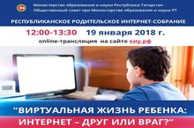 Во исполнение плана работы Министерства образования и науки Республики Татарстан 19.01.2018 с 12.00 до 13.30 состоится Республиканское родительское интернет-собрание «Виртуальная жизнь ребенка: интернет – друг или враг?».