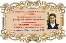 Поздравляем Самиру Гатауллину и её учителя Гульнару Шаукатовну Фасхутдинову с ПРИЗОВЫМ МЕСТОМ в муниципальном этапе Республиканской олимпиады школьников по РОДНОМУ (татарскому) ЯЗЫКУ среди учащихся 6 классов и желаем им новых ПОБЕД! Молодцы!!!