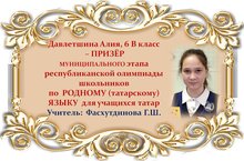 Поздравляем Алию Давлетшину и её учителя Гульнару Шаукатовну Фасхутдинову с ПРИЗОВЫМ МЕСТОМ в муниципальном этапе Республиканской олимпиады школьников по РОДНОМУ (татарскому) ЯЗЫКУ среди учащихся 6 классов и желаем им новых ПОБЕД! Молодцы!!!