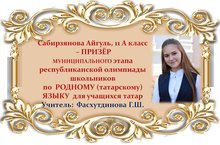Поздравляем Айгуль Сабирзянову и её учителя Гульнару Шаукатовну Фасхутдинову с ПРИЗОВЫМ МЕСТОМ в муниципальном этапе Республиканской олимпиады школьников по РОДНОМУ (татарскому) ЯЗЫКУ среди учащихся 11 классов и желаем им новых ПОБЕД! Молодцы!!!