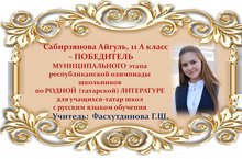 Поздравляем Айгуль Сабирзянову и её учителя Гульнару Шаукатовну Фасхутдинову с ПОБЕДОЙ в муниципальном этапе Республиканской олимпиады школьников по РОДНОЙ (татарской) ЛИТЕРАТУРЕ для учащихся-татар школ с русским языком обучения среди 11 классов и желаем им новых ПОБЕД! Молодцы!!!