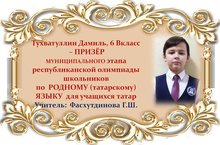 Поздравляем Дамиля Тухватуллина и его учителя Гульнару Шаукатовну Фасхутдинову с ПРИЗОВЫМ МЕСТОМ в муниципальном этапе Республиканской олимпиады школьников по РОДНОМУ (татарскому) ЯЗЫКУ среди учащихся 6 классов и желаем им новых ПОБЕД! Молодцы!!!