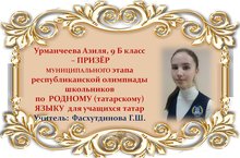 Поздравляем Азилю Урманчееву и её учителя Гульнару Шаукатовну Фасхутдинову с ПРИЗОВЫМ МЕСТОМ в муниципальном этапе Республиканской олимпиады школьников по РОДНОМУ (татарскому) ЯЗЫКУ среди учащихся 9 классов и желаем им новых ПОБЕД! Молодцы!!!