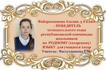 Поздравляем Азалию Файзрахманову и её учителя Гульнару Шаукатовну Фасхутдинову с ПОБЕДОЙ в муниципальном этапе Республиканской олимпиады школьников по РОДНОМУ (татарскому) ЯЗЫКУ среди учащихся 5 классов и желаем им новых ПОБЕД! Молодцы!!!
