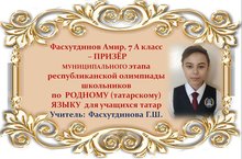 Поздравляем Амира Фасхутдинова и его учителя Гульнару Шаукатовну Фасхутдинову с ПРИЗОВЫМ МЕСТОМ в муниципальном этапе Республиканской олимпиады школьников по РОДНОМУ (татарскому) ЯЗЫКУ среди учащихся 7 классов и желаем им новых ПОБЕД! Молодцы!!!