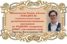 Поздравляем Чулпан Шагиахметову и её учителя Гульнару Шаукатовну Фасхутдинову с ПОБЕДОЙ в муниципальном этапе Республиканской олимпиады школьников по РОДНОМУ (татарскому) ЯЗЫКУ среди учащихся 9 классов и желаем им новых ПОБЕД! Молодцы!!!
