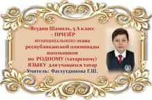 Поздравляем Шамиля Ягудина и его учителя Гульнару Шаукатовну Фасхутдинову с ПРИЗОВЫМ МЕСТОМ в муниципальном этапе Республиканской олимпиады школьников по РОДНОМУ (татарскому) ЯЗЫКУ среди учащихся 5 классов и желаем им новых ПОБЕД! Молодцы!!!