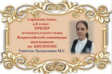 Поздравляем Анну Сарыкову и её учителя Марину Сергеевну Хуснуллину с ПРИЗОВЫМ МЕСТОМ в муниципальном этапе Всероссийской олимпиады школьников по БИОЛОГИИ среди учащихся 9 классов и желаем им новых ПОБЕД! Молодцы!!!