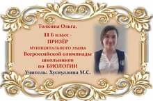 Поздравляем Ольгу Толкину и её учителя Марину Сергеевну Хуснуллину с ПРИЗОВЫМ МЕСТОМ в муниципальном этапе Всероссийской олимпиады школьников по БИОЛОГИИ среди учащихся 11 классов и желаем им новых ПОБЕД! Молодцы!!!