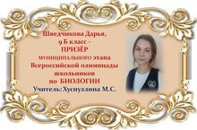 Поздравляем Дарью Шведчикову и её учителя Марину Сергеевну Хуснуллину с ПРИЗОВЫМ МЕСТОМ в муниципальном этапе Всероссийской олимпиады школьников по БИОЛОГИИ среди учащихся 9 классов и желаем им новых ПОБЕД! Молодцы!!!