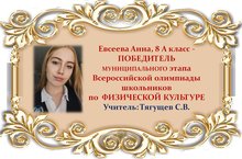Поздравляем Анну Евсееву и её учителя Сергея Владимировича Тягущева с ПОБЕДОЙ в муниципальном этапе Всероссийской олимпиады школьников по ФИЗИЧЕСКОЙ КУЛЬТУРЕ среди учащихся 8 классов и желаем им новых ПОБЕД! Молодцы!!!