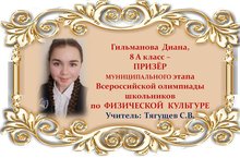 Поздравляем Диану Гильманову и её учителя Сергея Владимировича Тягущева с ПРИЗОВЫМ МЕСТОМ в муниципальном этапе Всероссийской олимпиады школьников по ФИЗИЧЕСКОЙ КУЛЬТУРЕ среди учащихся 8 классов и желаем им новых ПОБЕД! Молодцы!!!