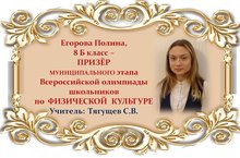Поздравляем Полину Егорову и её учителя Сергея Владимировича Тягущева с ПРИЗОВЫМ МЕСТОМ в муниципальном этапе Всероссийской олимпиады школьников по ФИЗИЧЕСКОЙ КУЛЬТУРЕ среди учащихся 8 классов и желаем им новых ПОБЕД! Молодцы!!!
