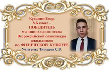 Поздравляем Егора Кузьмина и его учителя Сергея Владимировича Тягущева с ПОБЕДОЙ в муниципальном этапе Всероссийской олимпиады школьников по ФИЗИЧЕСКОЙ КУЛЬТУРЕ среди учащихся 8 классов и желаем им новых ПОБЕД! Молодцы!!!