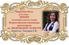 Поздравляем Юлию Миронову и её учителя Сергея Владимировича Тягущева с ПРИЗОВЫМ МЕСТОМ в муниципальном этапе Всероссийской олимпиады школьников по ФИЗИЧЕСКОЙ КУЛЬТУРЕ среди учащихся 9 классов и желаем им новых ПОБЕД! Молодцы!!!