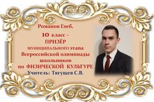 Поздравляем Глеба Романова и его учителя Сергея Владимировича Тягущева с ПРИЗОВЫМ МЕСТОМ в муниципальном этапе Всероссийской олимпиады школьников по ФИЗИЧЕСКОЙ КУЛЬТУРЕ среди учащихся 10 классов и желаем им новых ПОБЕД! Молодцы!!!