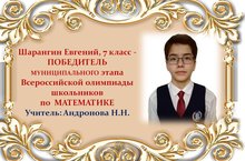 Поздравляем Евгения Шарангина и его учителя Наталью Николаевну Андронову с ПОБЕДОЙ в муниципальном этапе Всероссийской олимпиады школьников по МАТЕМАТИКЕ среди учащихся 7 классов и желаем им новых ПОБЕД! Молодцы!!!