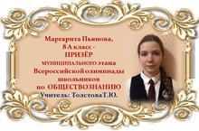 Маргарита - ПРИЗЁР муниципального этапа Всероссийской олимпиады школьников по ОБЩЕСТВОЗНАНИЮ! 07.12.2020