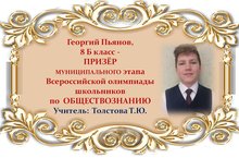 Поздравляем Георгия Пьянова и его учителя Татьяну Юрьевну Толстову с ПРИЗОВЫМ МЕСТОМ в муниципальном этапе Всероссийской олимпиады школьников по ОБЩЕСТВОЗНАНИЮ среди учащихся 8 классов и желаем им новых ПОБЕД! Молодцы!!!