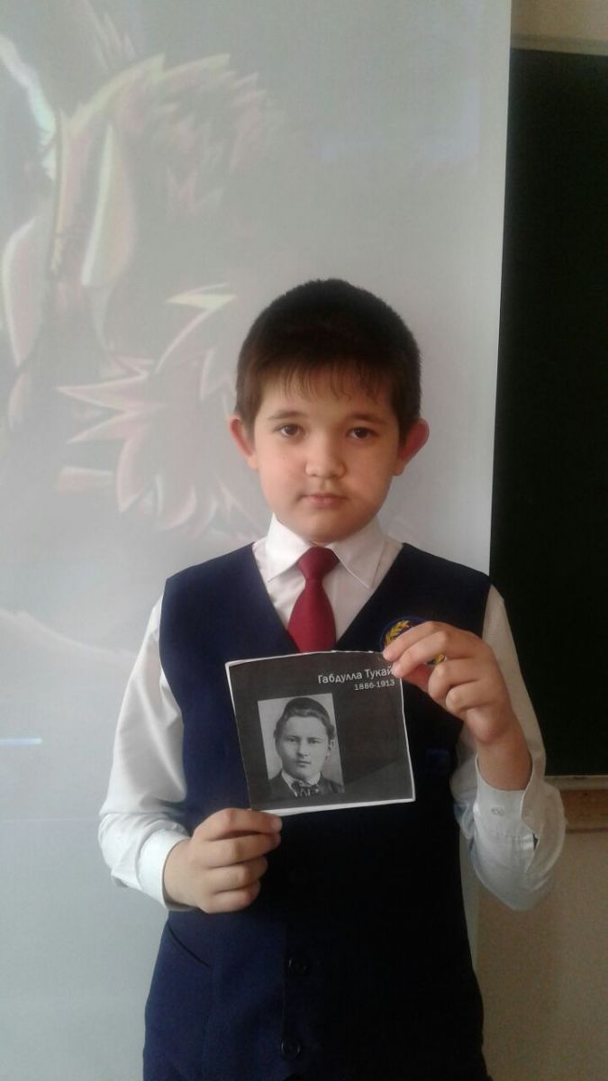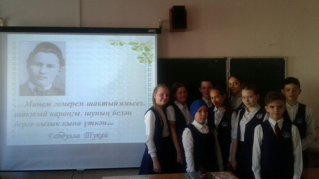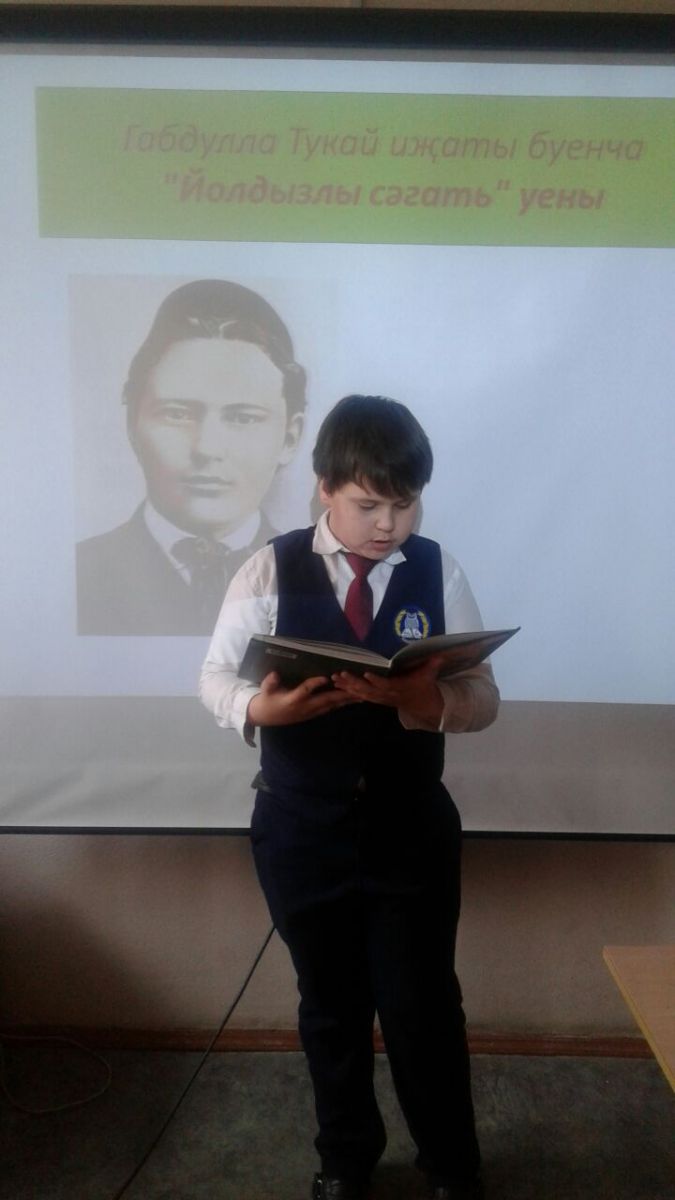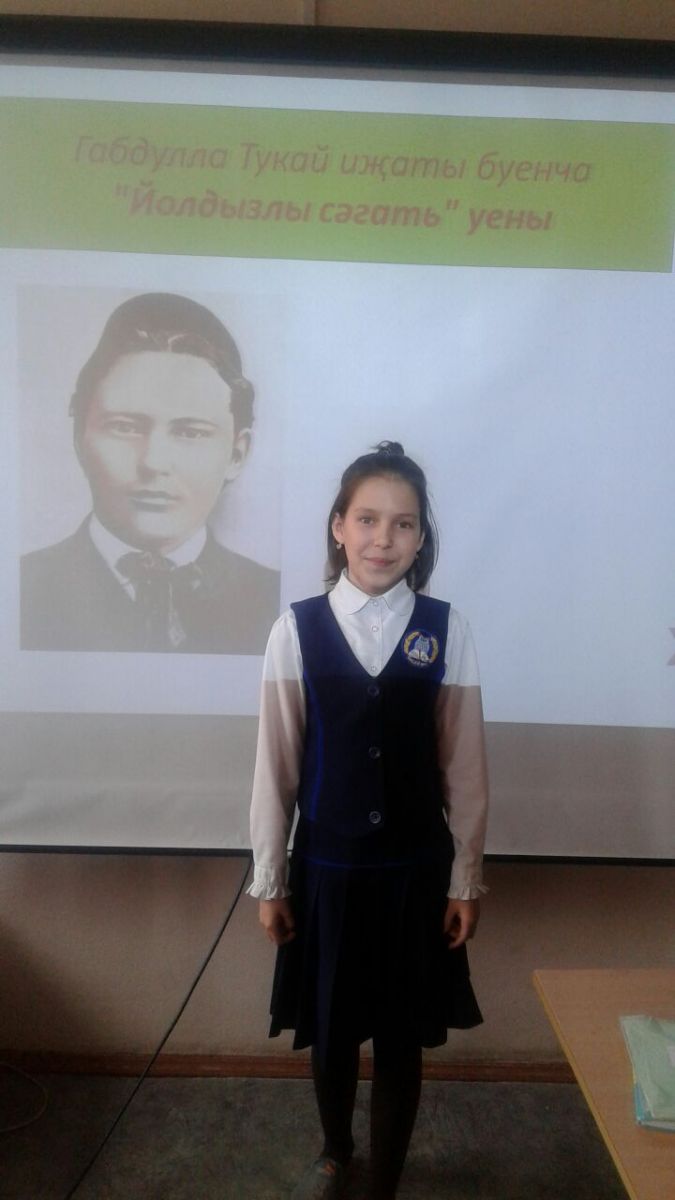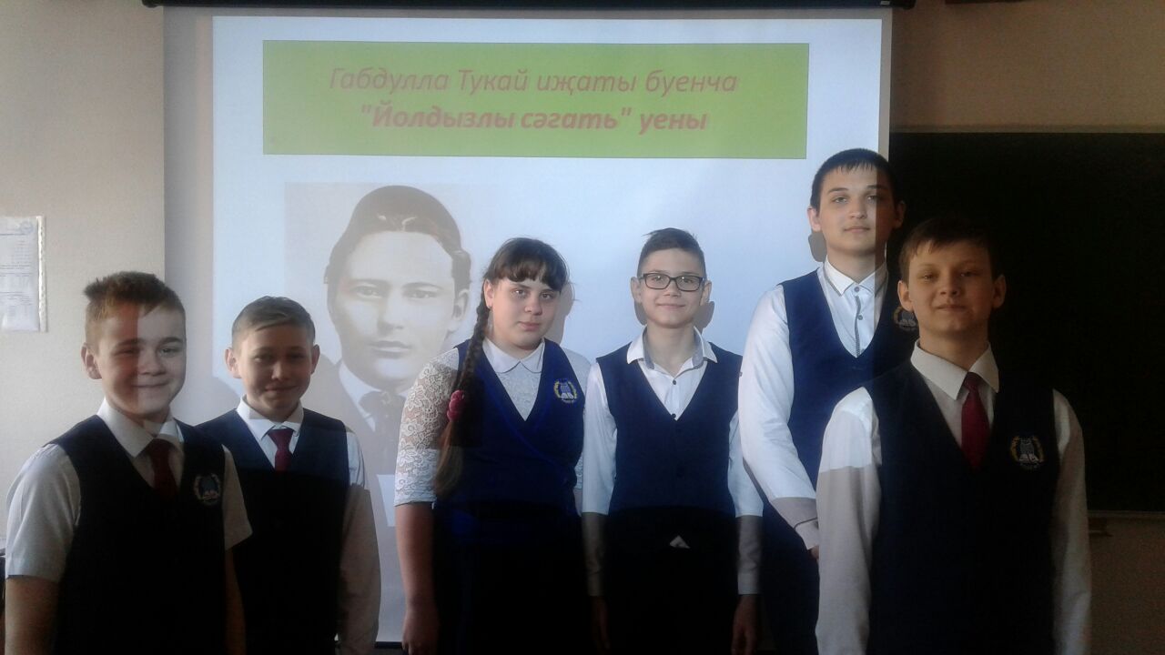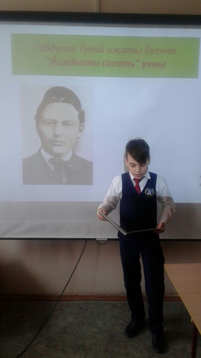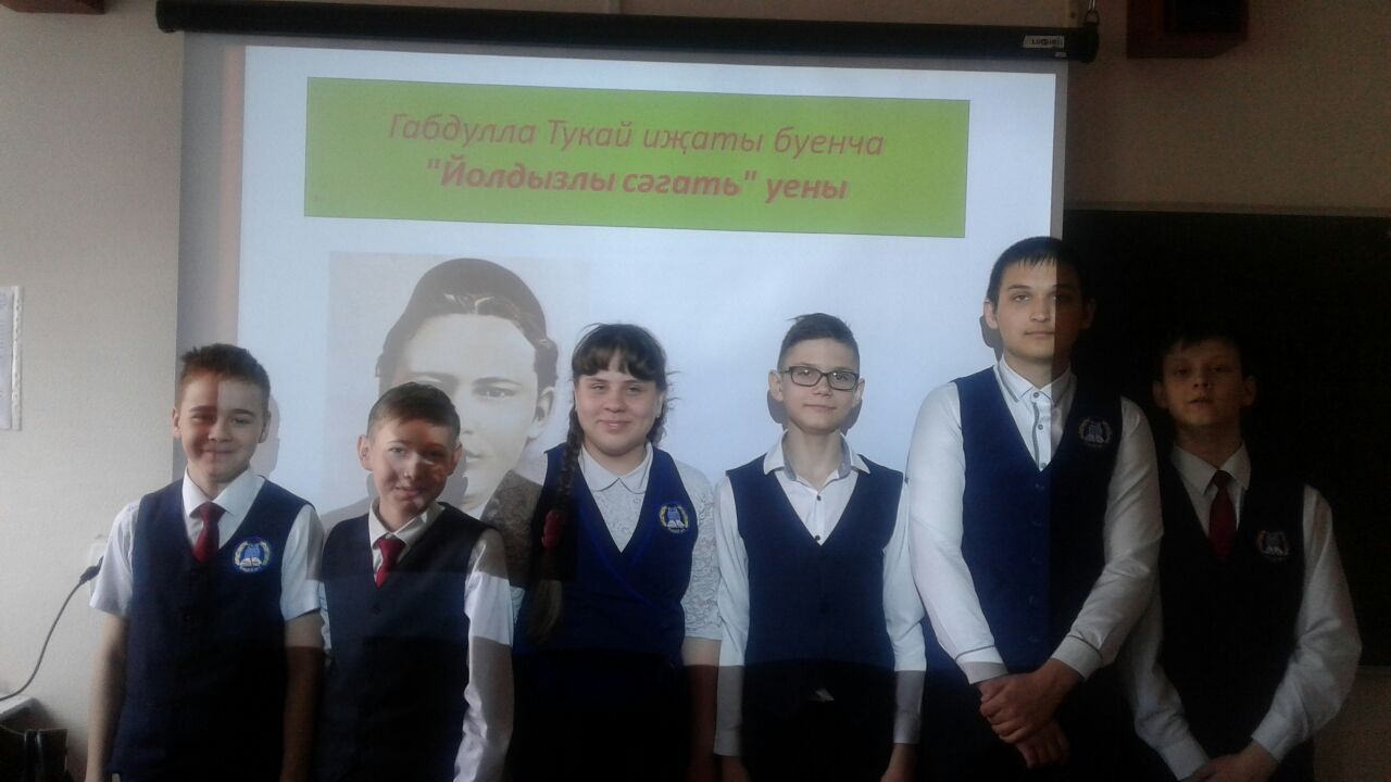 Опубликовано: 28.04.201827 нче апрельдә 5нче, 6 нчы сыйныфларда Г.Тукайның тормыш юлы һәм иҗаты буенча “Йолдызлы сәгать ” уены үткәрелде. Чарада укучылар әдипнең тормыш юлы һәм иҗаты турында белемнәрен күрсәттеләр. Чара шагыйрьнең шигырьләрен сөйләү,әкиятләрен карау белән тәмамланды.