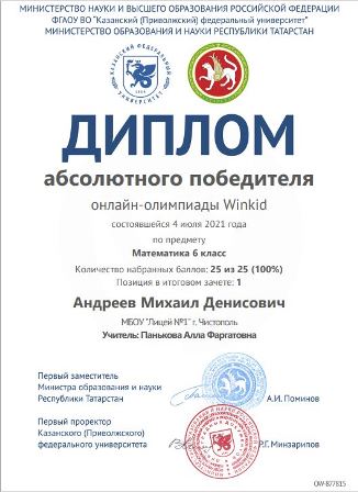 Опубликовано: 29.08.2021Летние каникулы - самые долгожданные каникулы для каждого школьника! Но наши лицеисты - школьники особенные: потребность в приобретении знаний у них не исчезает и во время отдыха. Вот, например, ученик 6 Б класса Миша Андреев, участвуя в республиканских онлайн-олимпиадах КФУ "WINKID" стал дважды (!!!) абсолютным победителем, набрав максимальные баллы на олимпиадах по математике и русскому языку! Миша, ты настоящий лицеист!)