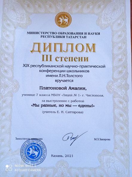 Опубликовано: 30.09.2021Поздравляем Платонову Амалию, Саттарову Елену Ивановну, учителя русского языка и литературы с победой на XIX республиканской научно - практической конференции школьников имени Л.Н.Толстого . Желаем новых творческих побед !