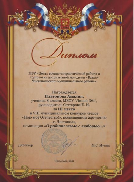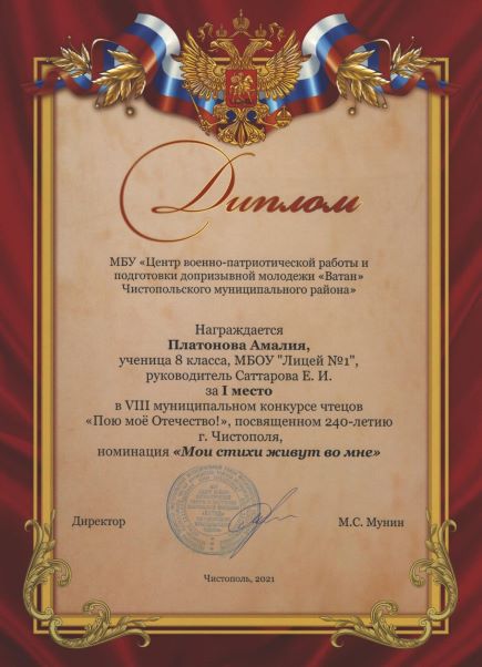Муниципальное бюджетное общеобразовательное учреждение «Лицей №1» Чистопольского муниципального района Республики Татарстан / Татарстан Республикасы Чистай муниципаль районы Муниципаль бюджет гомуми белем учреждениесе «1нче номерлы лицей»