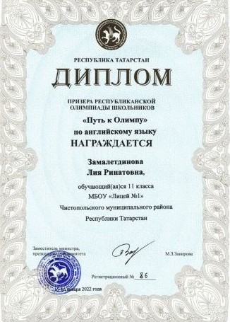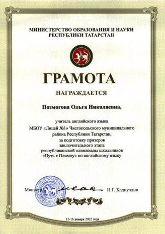 Опубликовано: 23.01.2022Лия - призёр республиканской олимпиады по английскому языку! Поздравляем Лию Замалетдинову, ученицу 11 класса, и её учителя Ольгу Николаевну Позмогову с ПРИЗОВЫМ МЕСТОМ в заключительном этапе республиканской олимпиады школьников по АНГЛИЙСКОМУ ЯЗЫКУ «Путь к Олимпу»! Молодцы! Новых вам побед!!!