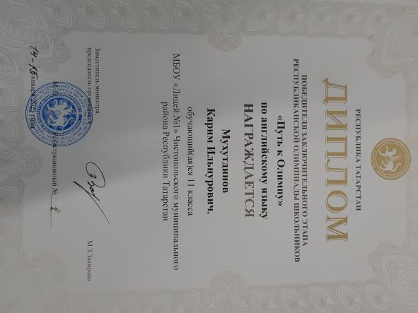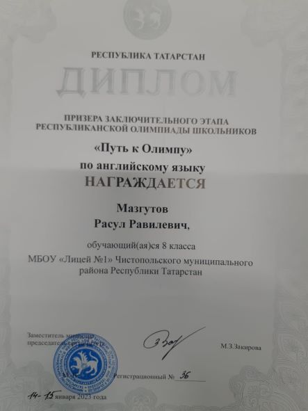 Опубликовано: 20.01.2023Поздравляем Мазгутова Расула, ученика 8 класса, Мухутдинова Карима , ученика 11 класса с победами в заключительном этапе республиканской олимпиады школьников по АНГЛИЙСКОМУ ЯЗЫКУ «Путь к Олимпу»! Молодцы! Новых вам побед!!!