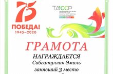 Учащийся 2 класса Сибгатуллин Э. занял I место в онлайн блиц-турнире по шахматам, посвящённом 75-летию Победы в Великой Отечественной войне среди мальчиков.