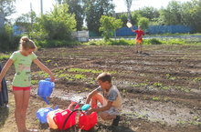 Учащиеся лагеря труда и отдыха «Радуга» работали на пришкольном участке: пропалывали грядки, досаживали цветы, высаживали капусту.