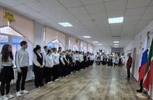 Утро понедельника в нашей школе началось с традиционной линейки с поднятием государственного флага и исполнением гимна РФ и РТ.