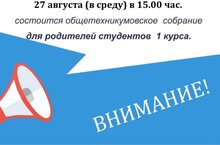 Внимание! Общее собрание для родителей студентов 1 курса состоится 27 августа 2025 г. в актовом зале техникума в 15.00 ч.