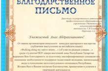 От имени организаторов зонального конкурса ораторского мастерства «Walking along my native streets…» («Гуляя по родным улицам…») среди студентов ПОО Северо-восточной зоны РТ неязыковых специальностей директору Нуруллину А.А. была выражена благодарность за вклад в пополнение интеллектуального потенциала республики и понимание необходимости поддержки талантливой молодежи.