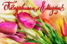 Поздравляем Вас с праздником весны, красоты и любви - с 8-м Марта! Желаем крепкого здоровья, удачи и осуществления всех надежд. Пусть каждый Ваш день будет солнечным, радостным, согрет счастьем, наполнен оптимизмом, а вокруг царят любовь и гармония. Мира, согласия, благополучия Вам и вашей семье!
