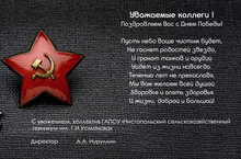 Уважаемые коллеги, дорогие студенты! Примите самые искренние поздравления с великим праздником – Днем Победы!Этот праздник стал символом героизма нашего народа, его несгибаемой стойкости и несокрушимости духа! Бережное отношение старшего поколения к судьбе своей Родины должно стать для всех ярким примером патриотизма и силы народной веры! Великой ценою заплатили ветераны за Победу, многих сегодня уже нет рядом с нами! Но мы помним об их воинской славе! Желаем Вам здоровья, душевного тепла, внимания и заботы близких! Пусть небо всегда будет мирным, а солнце светит ярко! -
