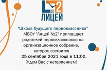 МБОУ "Лицей № 2" приглашает родителей будущих первоклассников на организационное собрание, которое состоится 25 сентября 2021 года в 11-00.