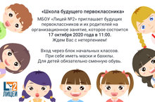 МБОУ "Лицей №2" приглашает будущих первоклассников и их родителей на организационное занятие, которое состоится 17 октября 2020 года в 11:00.