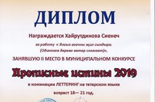 Студентка Чистопольского медицинского училища Хайрутдинова С. заняла второе место в муниципальном конкурсе "Прописные истины-2019" в номинации Леттеринг на татарском языке.